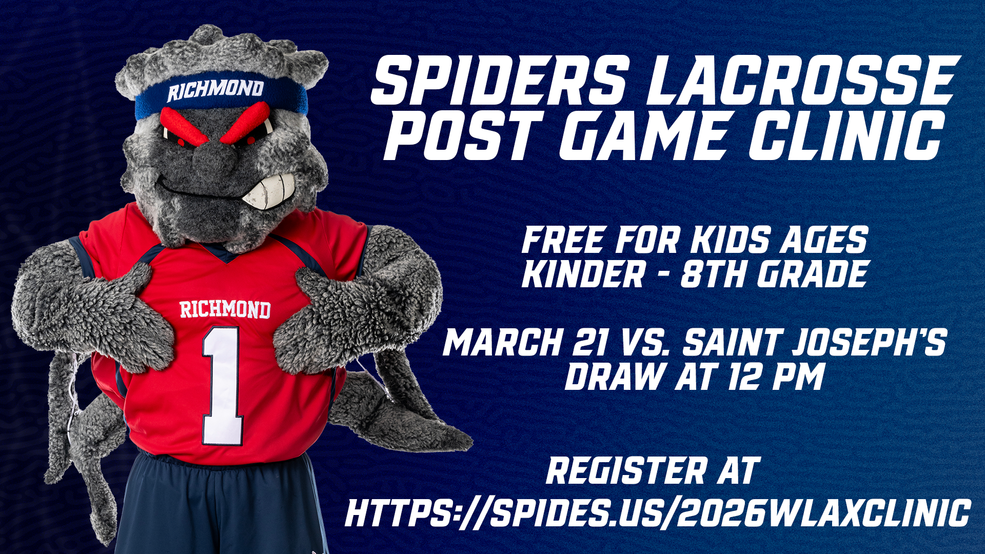 Thank you for expressing interest in our Spider Women's Lacrosse Camp on Saturday, Mar. 21st in Robins Stadium! The camp will begin approximately 15 minutes after the women's game against Saint Joseph's at noon. The clinic will last one hour.